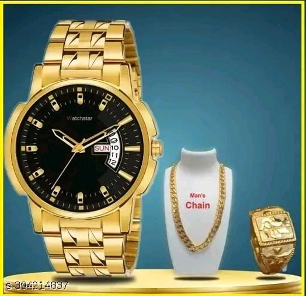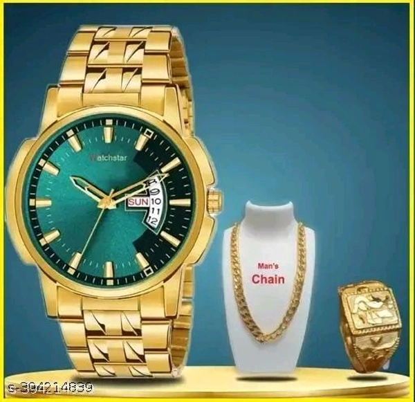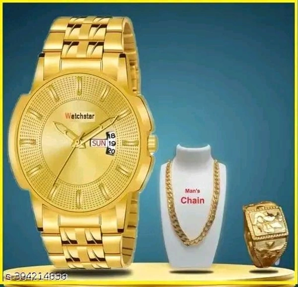 Watch With Mens Golden Chain and Golden More Ring For Boys